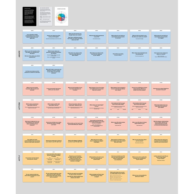 - 60 poker-sized cards, front side shows personal values and backside shows discovery questions