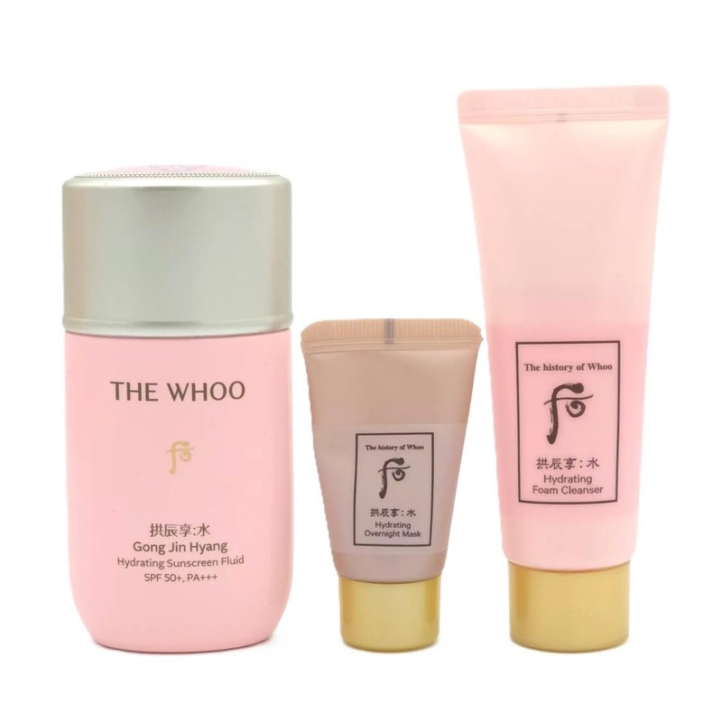 THE WHOO Hydrating Sunscreen Fluid Special 3 pcs Set (60ml UV Protective Lotion SPF 50+/PA+++, 13ml Overnight Mask, 40ml Foam Cleanser). Cooling-Anti-Aging-Moisturizing formula. Made in Korea
