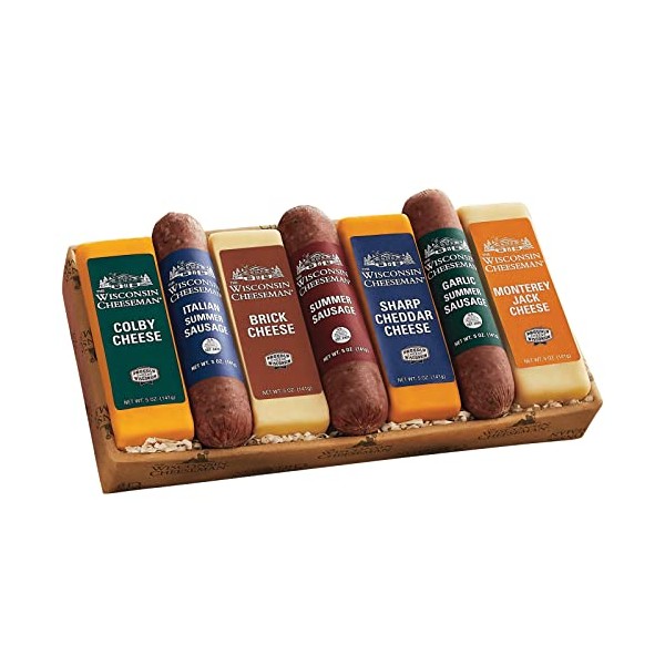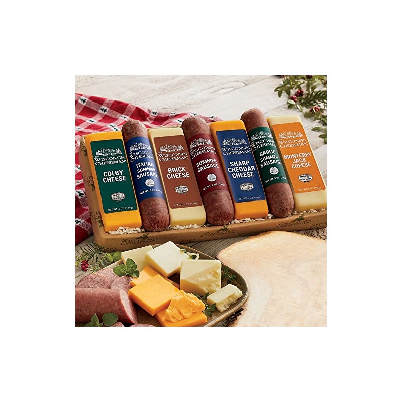 The Wisconsin Cheeseman Meat and Cheese Combo - Featuring Italian, Original and Garlic Summer Sausages, Colby, Brick, Sharp Cheddar, and Monterey Charcuterie Boards, Charcuterie Gift Basket Set