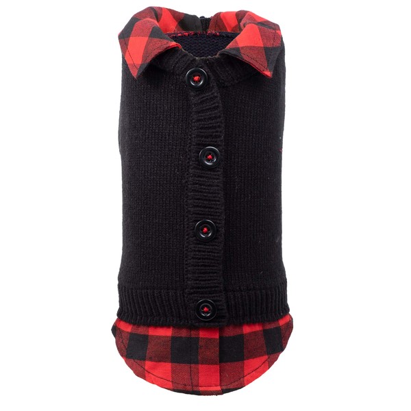The Worthy Dog Plaid Layered-Look Two-fer Pet Pullover Cardigan Sweater, Warm Knitwear Winter Clothes for Pets, Cold Weather Outfits for Dogs, Black - XL