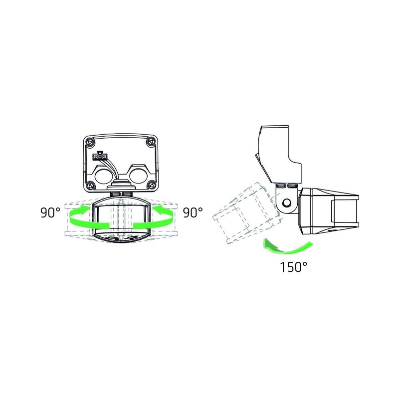 - Sensor rotates ± 90° horizontally and 90° down/backwards