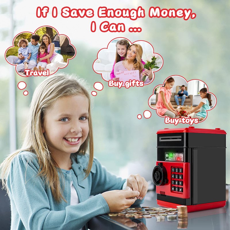 Thedttoy Kids Money Safe Piggy Bank Toy Money Bank w/Electronic Lock, Auto Scroll Paper ATM Machine Money Box Safe for 3-12 Years Old Children Boys Girls, Best Toy Gifts for Birthday Christmas (Red)