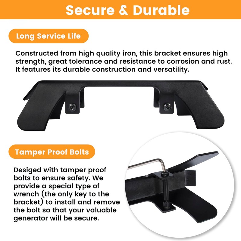 - HIGH QUALITY MATERIAL: Made from powder coated iron and installed with tamper proof bolts, our high quality security bracket ensures a long time service, keeping your valuable generator safe.