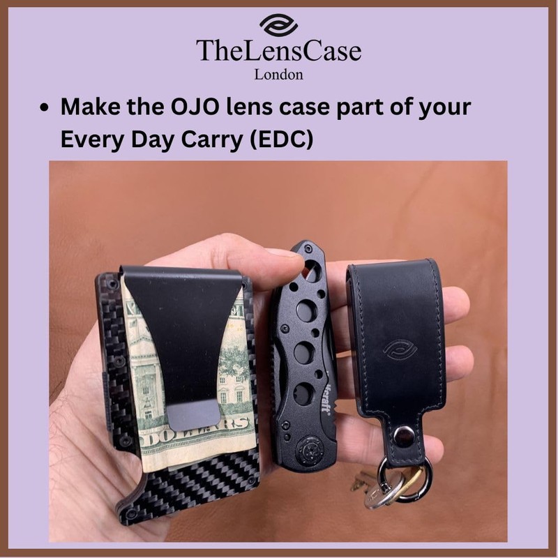 DescriptionThe OJO is perfectly sized lens case designed for people on the go who always want to be sure they have a spare pair of lenses with them. Whether a lens gets scratched, or falls out in the course of the day, the OJO lens case will be there with you. Made from full grain, LWG* certified leather and with a solid popper closing mechanism, and split ring, the OJO can be attached to your keyring, sports bag, briefcase or hand bag. The simple solid structure of the case ensures that the lens foils are not inadvertently pierced by sharp objects. With a built-in mirror to aid the user in putting in their lenses this is a stylish addition to your collection of travel accessories. No plastic hardeners are used in the manufacture of the case. Dimension: Length: 9cm Width 4 cm Depth 2cm *LWG is the Leather Working Group. LWG Audit Standards are designed to provide transparency and accountability within the leather supply chain. https://www.leatherworkinggroup.com/
