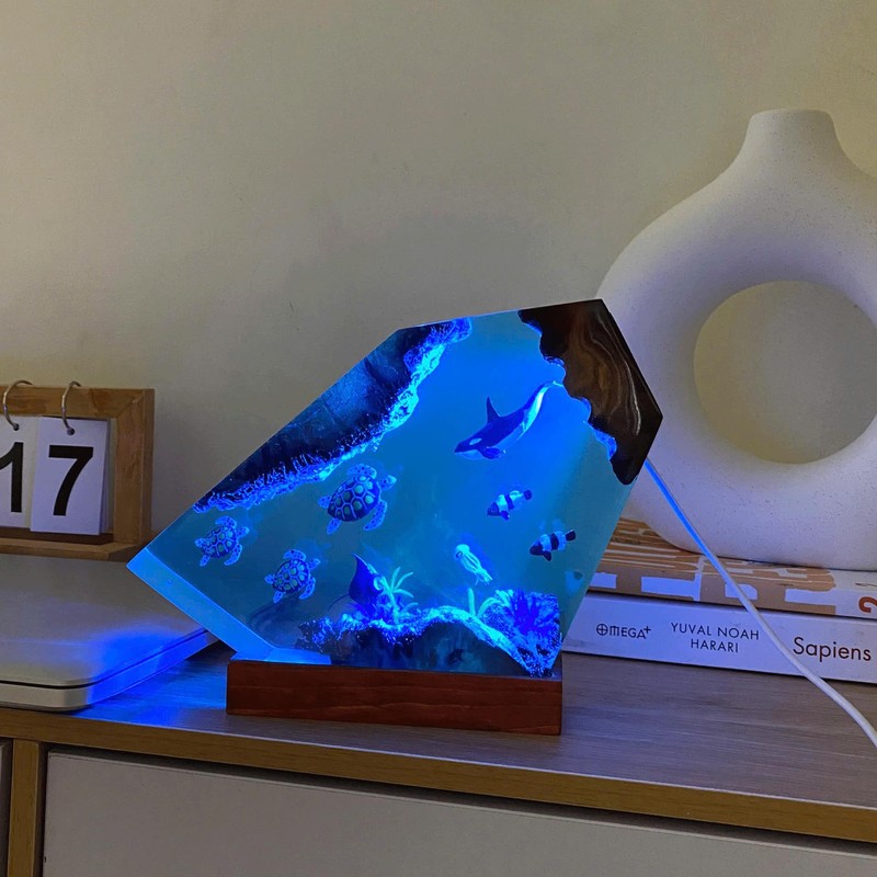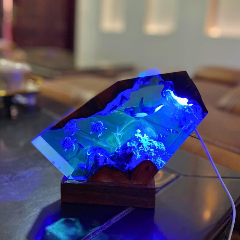 - ๐ฆ๐ฃ๐๐๐๐๐ ๐๐๐ฆ๐๐๐ก: The design makes it look like a pretty deep sea decor, killer whale share and turle , this ocean desk lamp that makes you feel underwater. The base is wooden and has changeableLED lights inside. These lights show all the details, making it a standout aquarium night light.