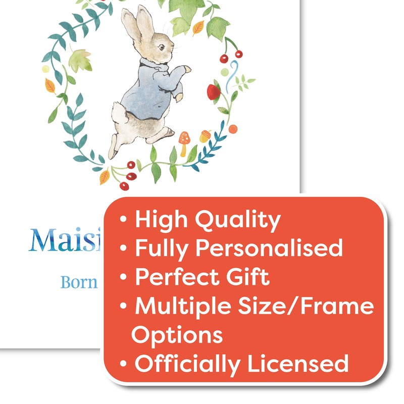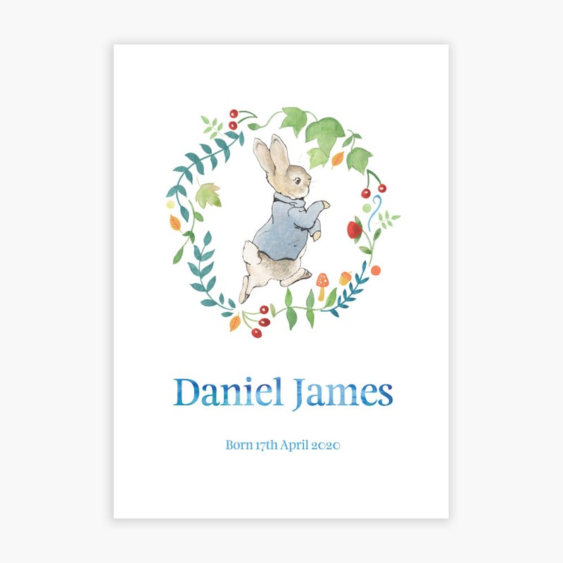 Themed Peter Rabbit Print - Wreath Name and Date Personalised Nursery Wall Art (A2-42cm x 59.4cm)