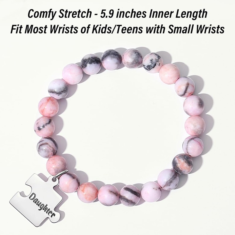 - 【Stokcing Stuffers for Kids 】This handmade bracelet for daughter has an anti-tarnish charm engraved "Daughter", a double-side card printed "To my daughter, Thank you for being such an important piece of my life. Love you forever" and the benefits of the stones. The Pink Zebra Jasper brings her calmness and helps your daughter find her balance in life. This bracelet for daughter is great as stocking stuffers for kids, kids birthday gift for daughter, 8 10 12 14 16 18 year old girl gift ideas.