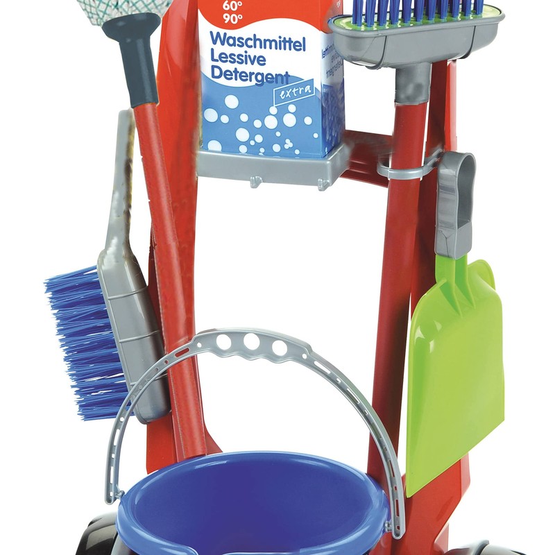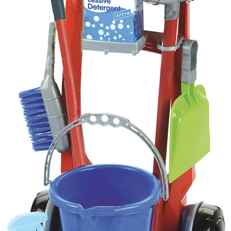 Child size Cleaning Trolley comes on wheels with bucket, mop, broom, hand broom and pail, sponge, cloth and more. Great way to stimulate imagination. Quality components. Hours of pretend-play fun.