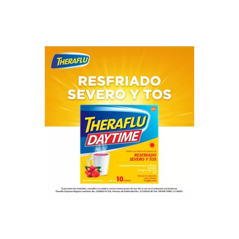 Theraflu Té Antigripal Daytime es auxiliar en el alivio de los síntomas de RESFRIADO SEVERO Y TOS y reduce los síntomas más molestos de gripa y tos.