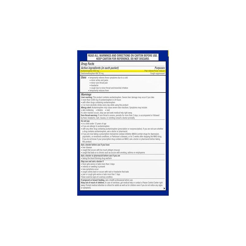 - Powerful relief from severe cold, cough, and flu symptoms such as sore throat pain, headache, and minor body aches and pain