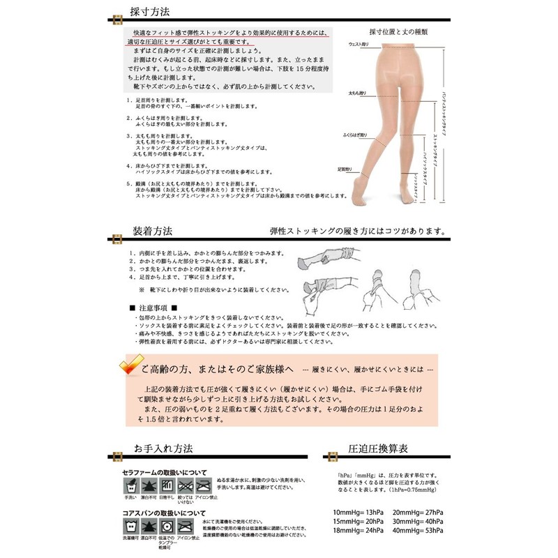 • Strong pressure (0.8 - 1.2 inches (20 - 30 mmHg) makes it difficult to wear. Please be aware of those who are beginning to elastic stockings
