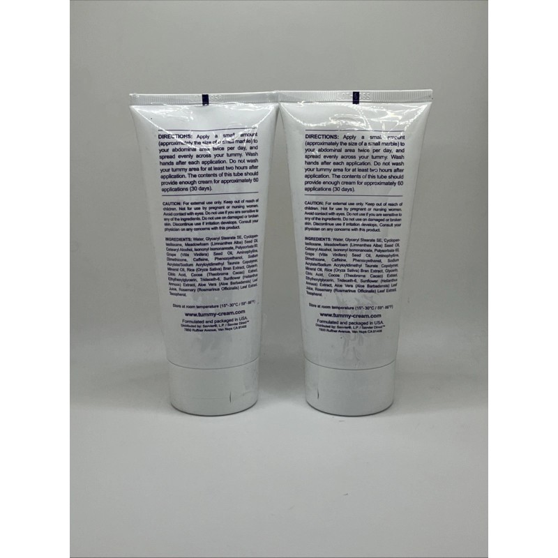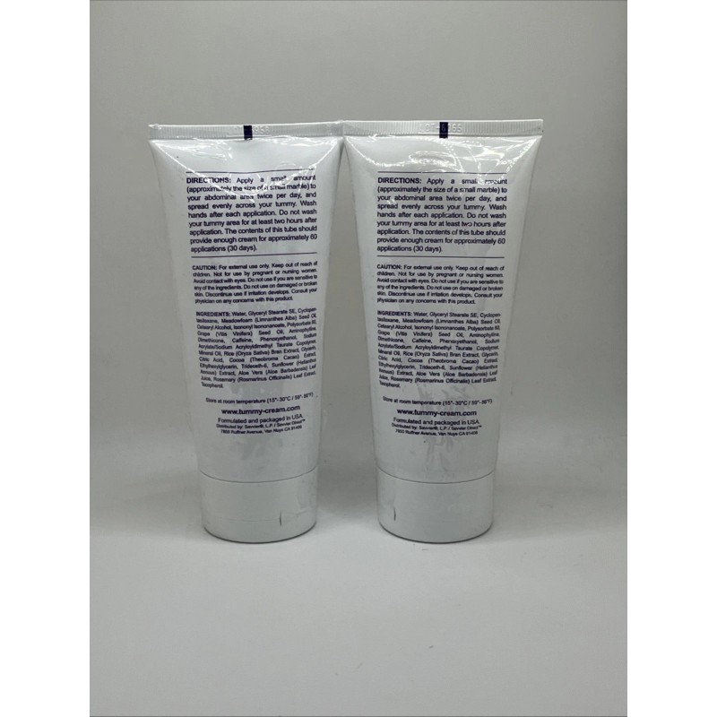 Brand new and sealed tube of Tummy Cream, (2) 6 fl oz (177 mL) size. This moisturizing cream is designed to nourish and hydrate skin, particularly around the stomach area, making it ideal for pregnancy or postpartum care. The formula is typically used to help reduce the appearance of stretch marks and improve skin elasticity.