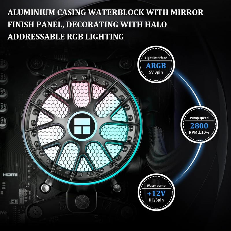 - [Round Colorful Pump Head] The vortex round cold pump head adopts the exclusive structure of the fourth-generation water pump, the vortex design and the ARGB halo under the logo luminous logo, creating a colorful and unique visual experience, and the pump speed can reach 2800RPM±10%, which can effectively dissipate heat