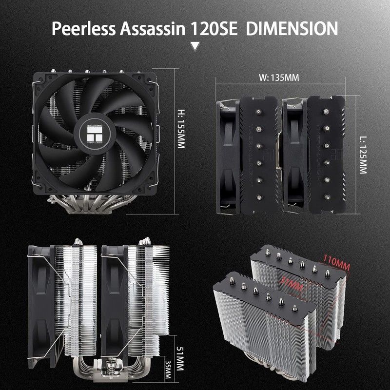 - [Product specification] Thermalright PA120 SE; CPU Cooler dimensions: 125(L)x135(W)x155(H)mm (4.92x5.31x6.1 inch); heat sink material: aluminum, CPU cooler is equipped with metal fasteners of Intel & AMD platform to achieve better installation, double tower cooling is stronger(Note:Please check your case and motherboard for compatibility with this size cooler.