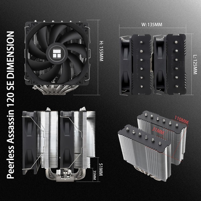 - [Product specification] Peerless Assassin 120 SE CPU Cooler; dimensions: 125(L)x135(W)x155(H)mm (4.92x5.31x6.1 inch); Heat sink material: Aluminum and Copper, CPU cooler is equipped with SS2 install system and metal pressure plate on heatsink to achieve better contact with CPU, and more heat exchange surface area with dual tower heatsink config. (Note: Please check your case and motherboard compatibility with cooler.)