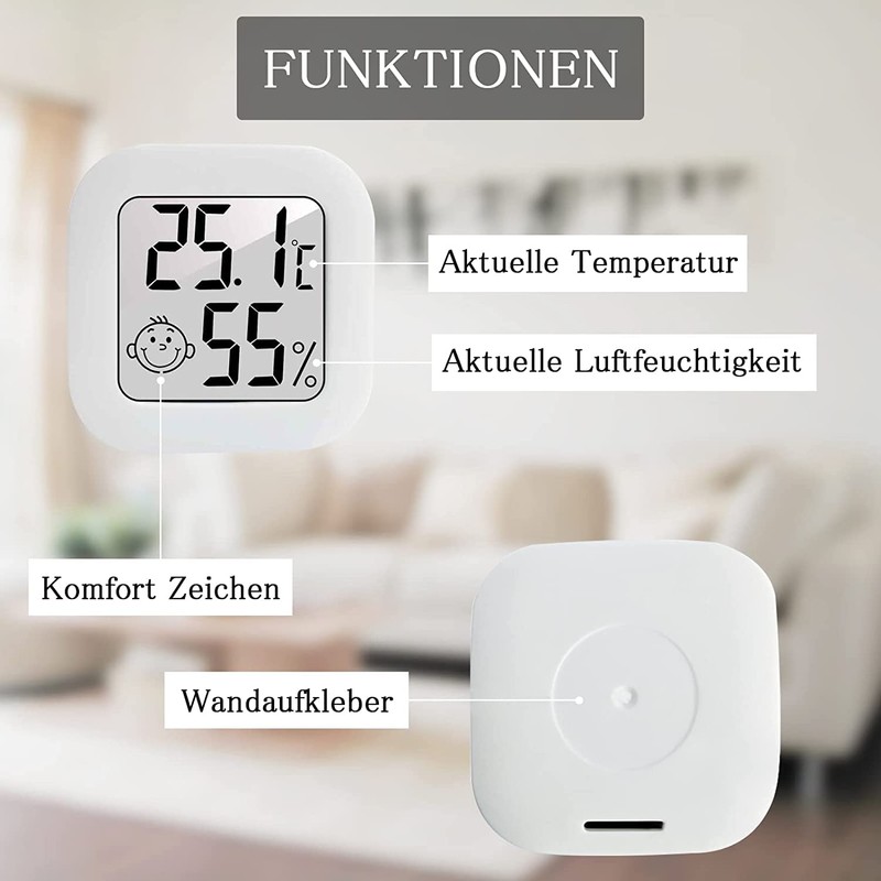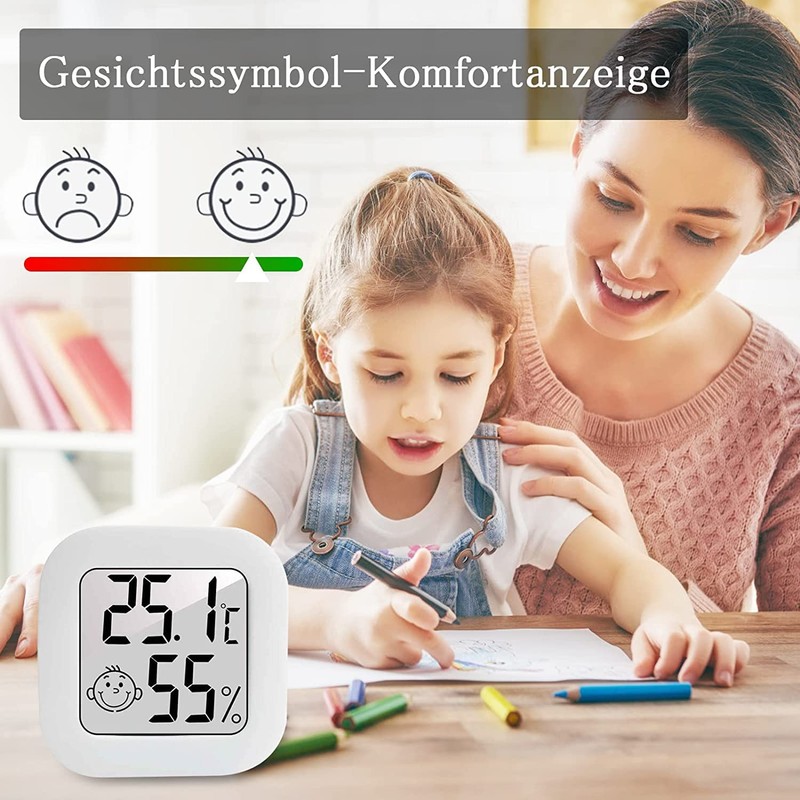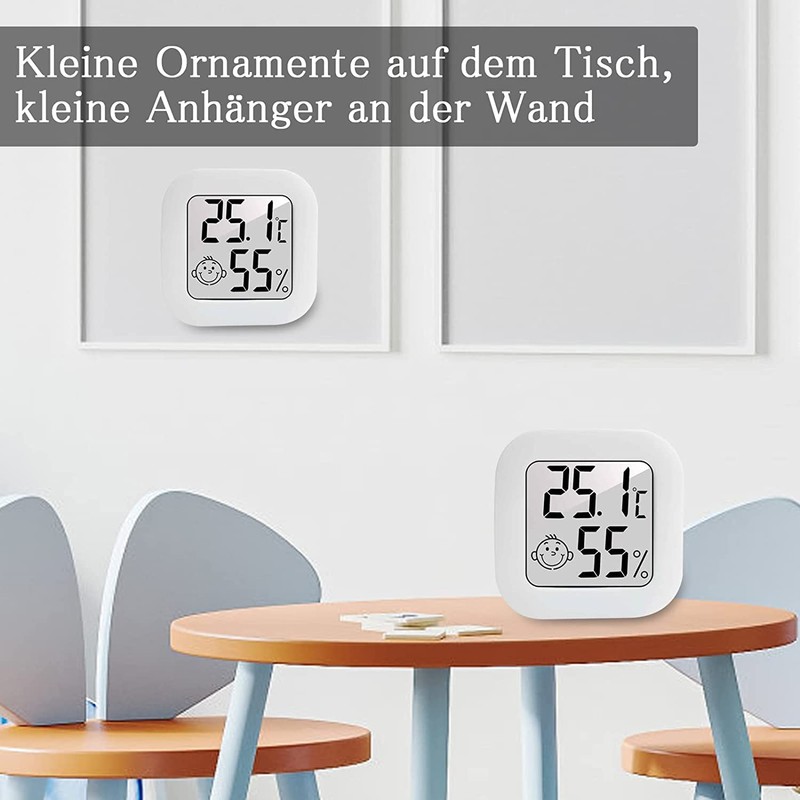 • Digital design: the mini digital hygrometer has 2 symbols. With a humidity between 40% and 70%, it shows a smiling face. If the humidity is below 40% or above 70%,