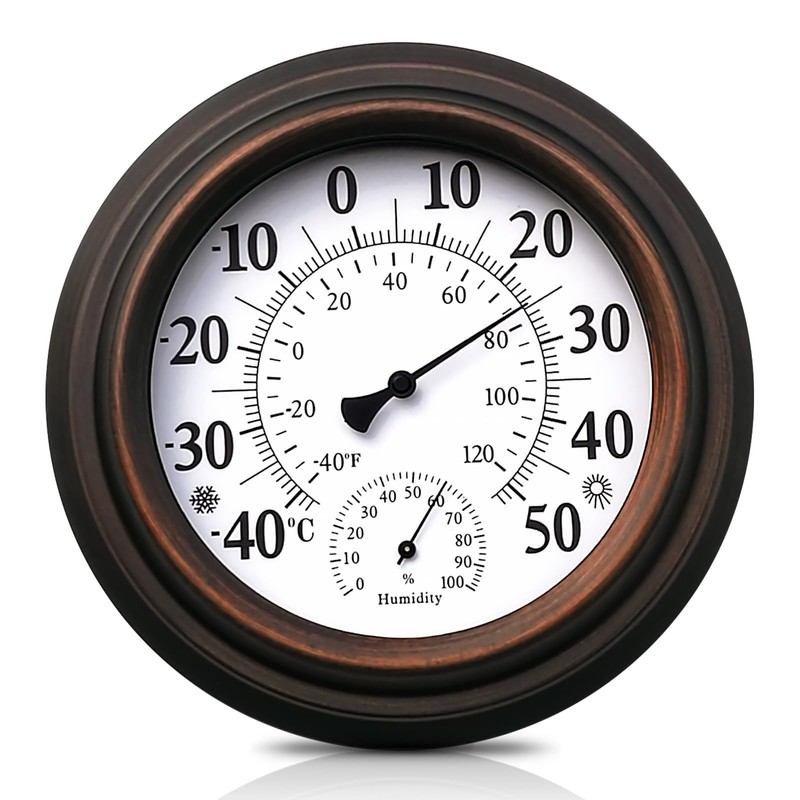 - Easy to read: The analogue outdoor thermometer has a large, white dial with clear, black numbers and a stylish hand that makes the temperature and humidity easy to read even from a distance. The snow and sun patterns on the surface are for additional reference.