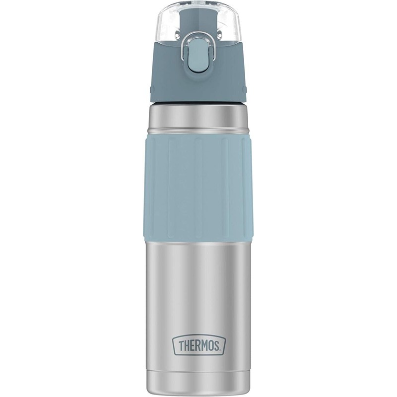 Thermos products deliver what matters every time. As the leading manufacturer of convenient insulated products for over 100 years, Thermos is trusted by consumers to provide innovative portable containers that promote a safe and healthy lifestyle. Thermos delivers when it matters. Thermos brand products offer superior cold retention that keeps beverages cool and delicious for hours, and the 2465 Vacuum Insulated Hydration Bottle is no exception. Thermos vacuum insulation technology virtually eliminates temperature change within the beverage container by creating an airless space between two stainless steel walls. The result is an insulation layer that performs better than any other. A superior insulated container you can depend on to keep your beverages colder, fresher, longer. This hydration bottle keeps beverages cold up to 14 hours more than 10 times longer than an ordinary plastic water bottle. Constructed with double wall stainless steel, this 18-ounce bottle is virtually unbreakable and built to withstand the demands of everyday use. A comfortable silicone grip makes the bottle easy to grasp and the bottle is sized to fit most automobile cup holders. The Thermos 2465 Vacuum Insulated Hydration Bottle comes equipped with a hygienic, push-button, locking lid which can be operated easily with one hand. And because of the double wall insulation, the stainless-steel body stays condensation-free with cold beverages. In order to maximize the incredible insulation technology, it is recommended to pre-chill the bottle just prior to use. This can be accomplished by filling the bottle with cold tap water, attaching the lid and letting it rest for a few minutes. Before you are ready to use, simply empty the water and fill with your favorite beverage. Attaching the lid will further increase the thermal efficiency.