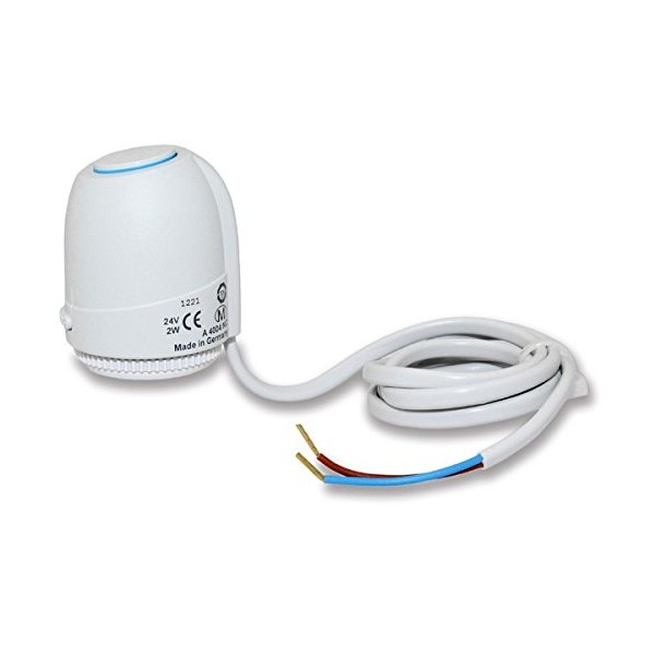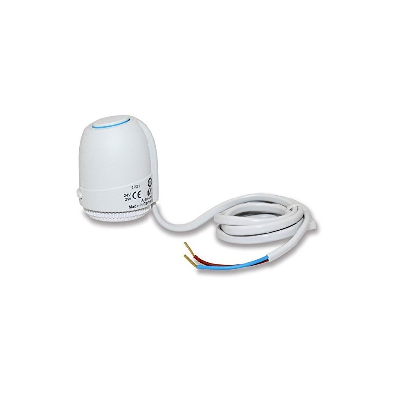 Thermostatic Manifold Actuator valve for SSM series stainless steel manifolds. 24V, 0.12A, 2-wire. Operating temperature (max): 140F Operating temperature (min): 32F Features easy-to-install snap action mechanism. Comes with a manifold seat and 40" long wire. This actuator is designed to replace manual balancing valve on SSM or BSM series manifold to provide electronic control of an individual zone (branch). Several actuators can be installed to achieve full control of the manifold. Compatible with Taco ZVC controls and similar. Installation: 1. Remove manual balancing valve by unscrewing it counter- clockwise (viewed from top). 2. Replace it with a white O-ring included in the box with actuator. 3. Snap on the actuator. Wiring can be forward-facing or backward-facing for installation convenience. 4. Connect actuator wires to the zone valve outlets of the Taco ZVC panel (refer to ZVC manual for instructions).