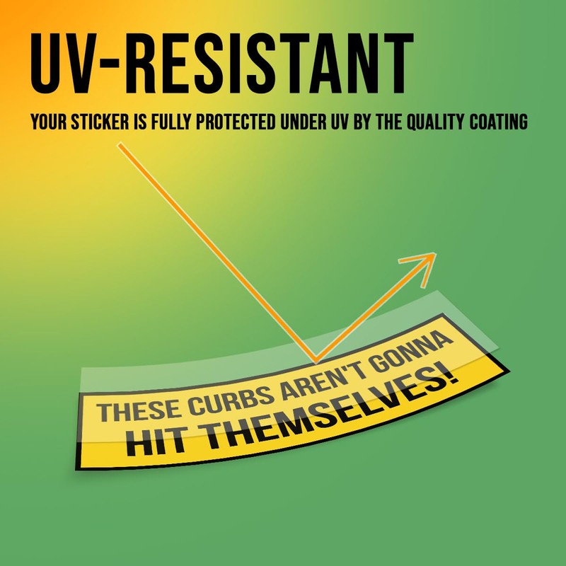 - Scratches Resistant: Our Hit A Curb sticker are fortified with a matte protective lamination that safeguards against scratches, fading, and general wear and tear. Additionally, it adds a water-resistant barrier, making our stickers suitable for both indoor and outdoor use.