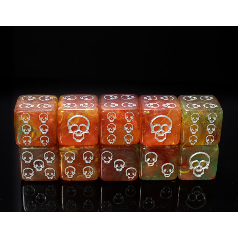 - Complete 10-dice set of six-sided dice, each decorated with spooky skull shapes instead of regular dice pips. Use them in your next gaming session - great for RPG campaigns, board games, dice games etc.