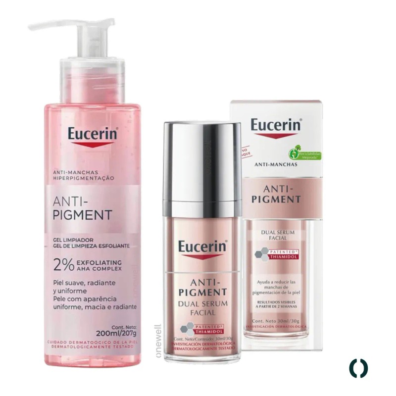 El Kit Eucerin Anti Manchas es una rutina completa para combatir la hiperpigmentación y lograr una piel más uniforme y luminosa. Incluye un gel limpiador que prepara y mejora la textura cutánea con ingredientes exfoliantes suaves, y un serum intensivo que reduce las manchas y evita su reaparición gracias a su fórmula innovadora con Thiamidol y ácido hialurónico.