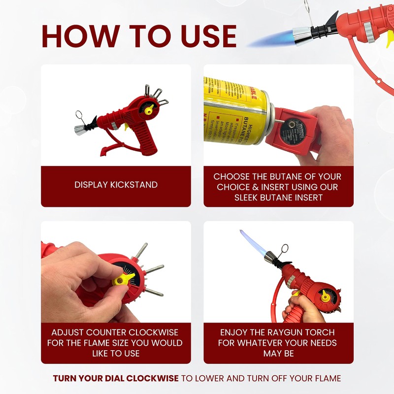 - Note: Don't let the Raygun flashlight stay lit for more than seconds. Make sure the yellow butane nozzle stays off by turning completely to the right. Keep away from children and pets Not a toy. Use responsibly