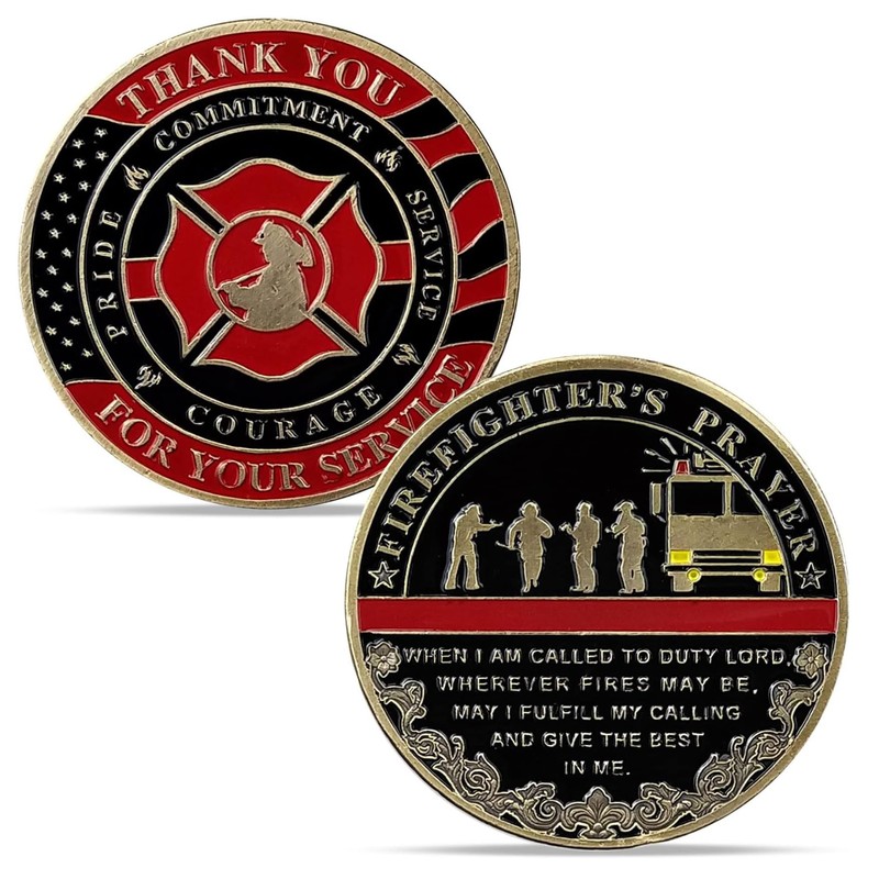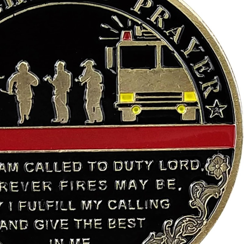 - The Reverse of The Challenge Coin has the firefighters are on duty with fire truck, the Firefighter's Prayer under the thin red line.