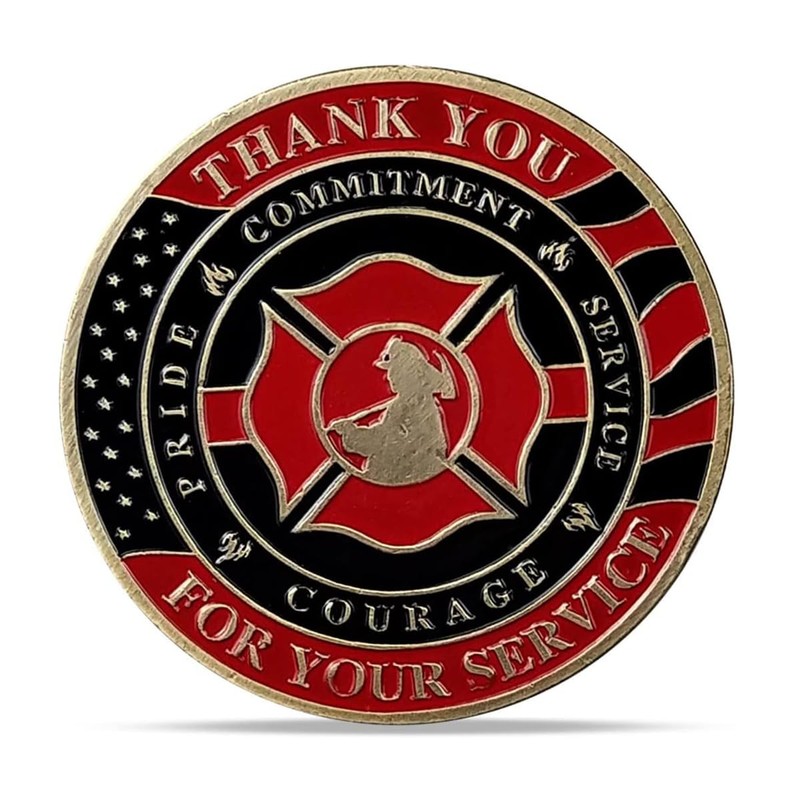 - Front of the fireman challenge coin show appreciation to firefighters with a firefighter symbol and text of firefighter spirits: Pride, Commitment, Service, Courage.