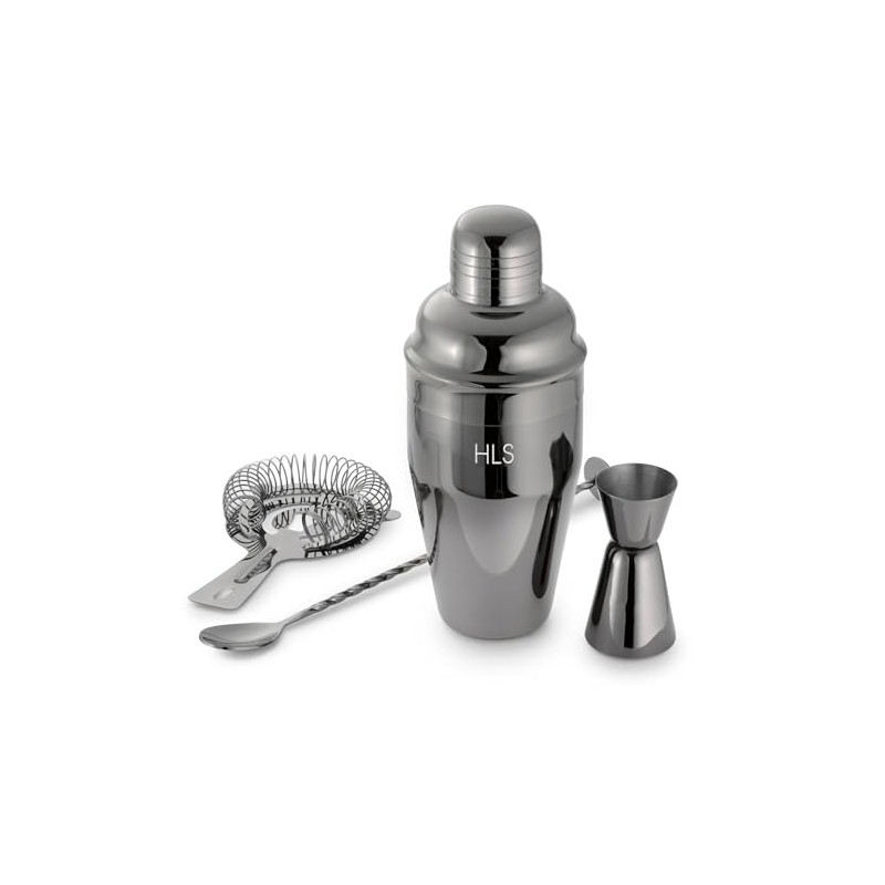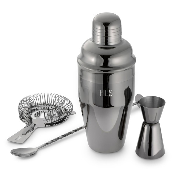 Our Engraved Gunmetal Shaker Set is all they'll need to put the finishing touches on their favorite drink! This set comes with a shaker, strainer, bar spoon, and a double-sided jigger. Engrave the shaker with their initials. Exclusively designed by Things Remembered