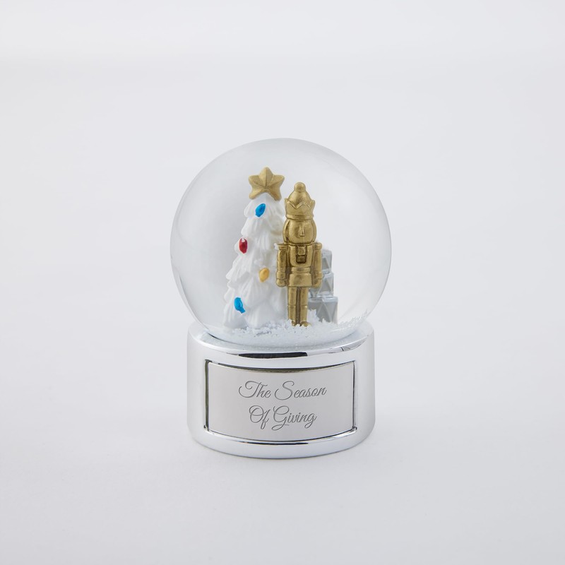 • SUPERIOR QUALITY AND DESIGN – Enjoy our specially designed Snowglobe for a special dash of Holiday Cheer this Christmas Season. Our snow globe features a gold Nutcracker standing next to a small white tree decorated in colorful lights and a gold star. Beside them sits a grey drum set while the base is especially designed in mirrored silver surrounding a metallic silver plaque with your personalization on it. It also comes with it's own branded gift box.