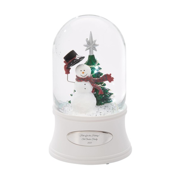 Spread joy and cheer this holiday season with the Things Remembered Snowman with Top Hat Light-Up Snow Globe. This festively fun snow globe includes a holiday scene of a joyful snowman lifting his top hat and a Christmas tree complete with lights that really light up. The globe sits atop a white base, the perfect canvas for your personalization to really shine. Engrave the front of the base with a family name, friendly greeting, or holiday lyric to complete the gift with a personal touch.