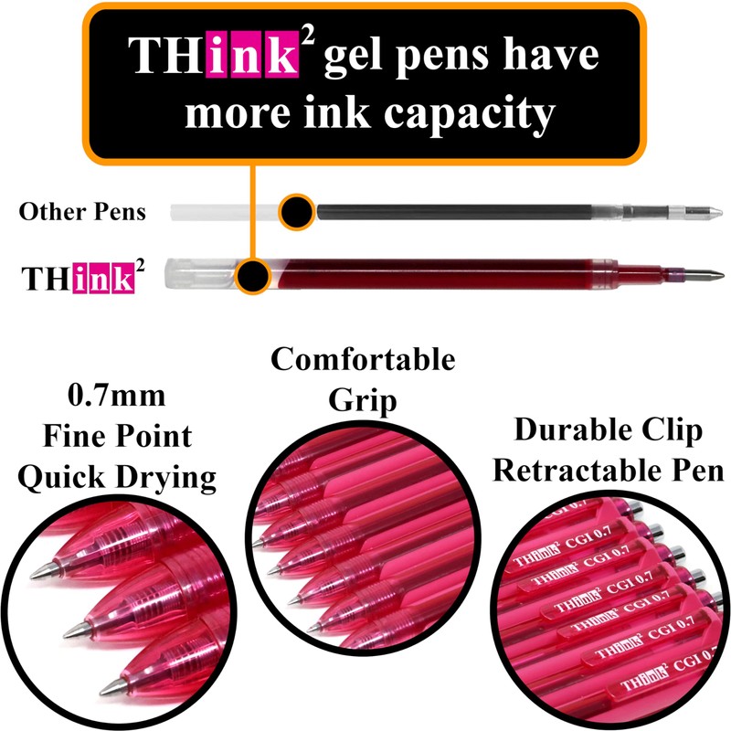 THINK2MASTER [24 Pens - Pink Ink] Think2 0.7mm CGI Retractable Gel Pens. (24 Pink) Medium Point Rollerball Pens with Smooth Quick Drying Ink.