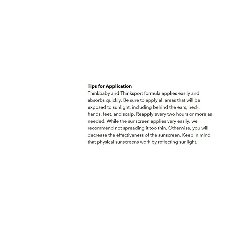 Thinkbaby Safe Sunscreen was the first sunscreen to pass Whole Foods Premium Care requirements, and has held the highest rating in EWG's database since 2010 with a “1” rating. As a company, Thinkbaby targets products containing questionable ingredients and develops safer alternatives. We led the movement from BPA, with the 1st BPA-free baby bottle (2006) to the 1st insulated BPA- free sports bottle (2006). We brought the same focus to developing body care and sun care products. None of our products have ever contained avobenzone, oxybenzone, parabens, phthalates, PABA, or 1,4 dioxane, to name a few of the chemicals of concern. At SPF 50+ with broad-spectrum protection for UVA and UVB, and the highest water resistance allowed by the FDA, you can expect a highly effective solution for your littles and whole family. We are strictly against the use of aerosols due to inhalation concerns to the effectiveness and safety for users and the environment. Our mineral based (zinc oxide) formulations go on smooth and absorb easily without leaving you feeling sticky or goopy. Thinkbaby Safe Sunscreen has received a large amount of awards and has been featured in a tremendous number of publications including: Allure, Martha Stewart, New York Times, POPSUGAR, Travel & Leisure, The Bump, FoodBabe, Washington Post, Chicago Tribune, Natural Child, Whole Living, FitPregnancy, Baby List, Pregnancy & Newborn, and Parents to name a few. Member of: Sun Safety Coalition, Safe Sun Council, Safe Cosmetics Campaign.
