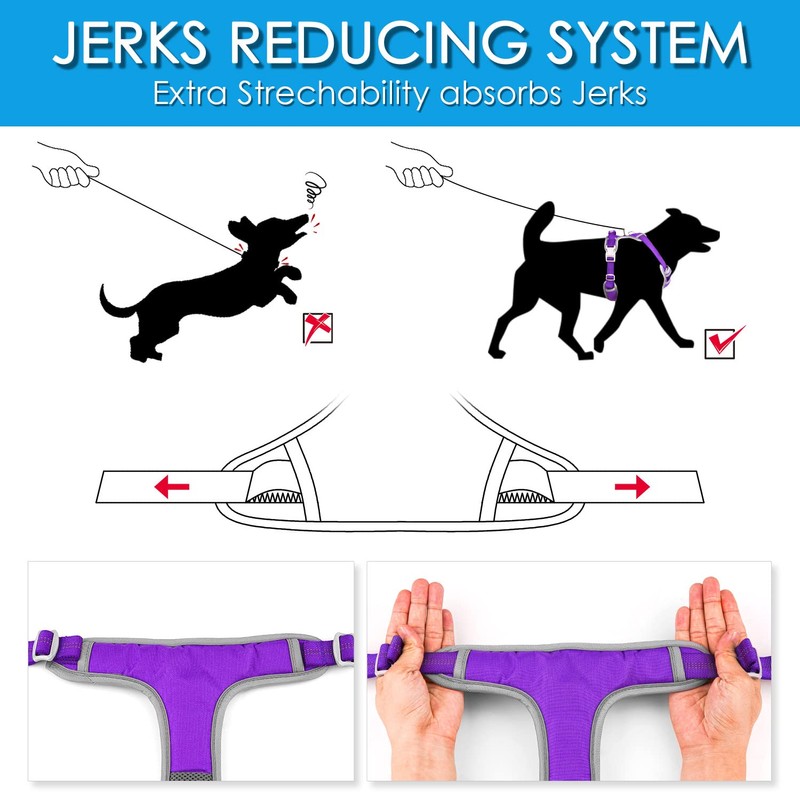 - DOG HARNESS WITH HANDLE: This dog vest harness comes with a wide handle on the back, which allows you to control the dog closely in emergency situations, such as when the dog is trying to pounce on someone, chasing other animals, or crossing the road. The flexible strap of our dog harness can prevent the dog from choking when pulled by humans, making the force evenly distributed.