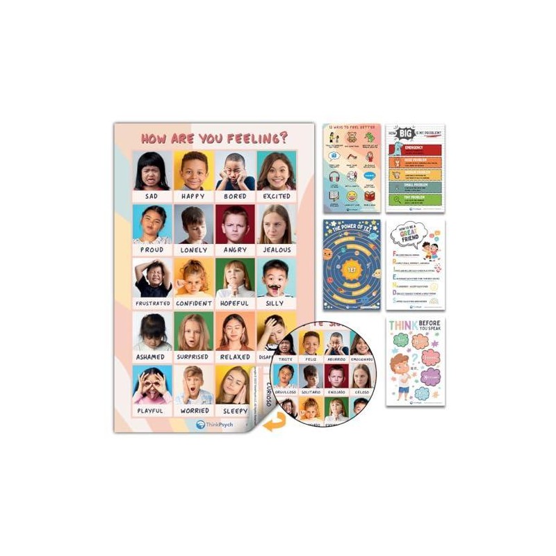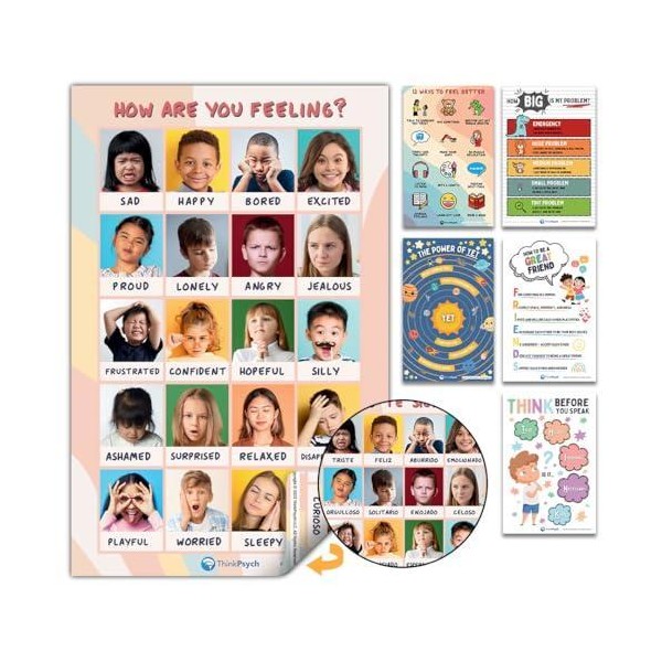 ThinkPsych Laminated Feelings Posters for Kids - English & Spanish - Double Sided - size: 6 Posters
