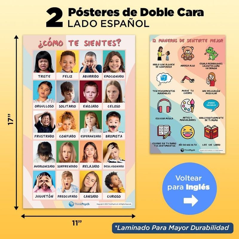 - BILINGUAL EMOTIONS POSTERS: Our LAMINATED 11x17 inch posters help kids identify feelings and learn important life skills. Each feelings poster has English and Spanish sides, making them inclusive educational tools for different language learners.