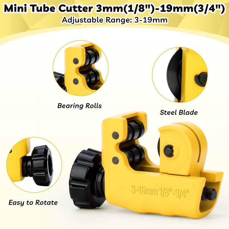 - 【Mini Copper Pipe Cutter】The mini tube cutter is just as impressive, with an adjustable cutting range of 1/8”-3/4” (3mm-19mm). It's perfect for cutting copper pipes, aluminum pipes, brass pipes, and other thin pipes. When using a mini pipe cutter to cut pipes, please tighten while cutting! Get ready to cut pipes with ease and precision!