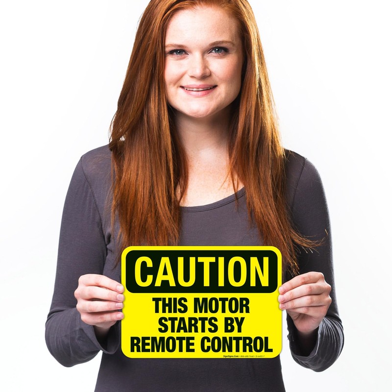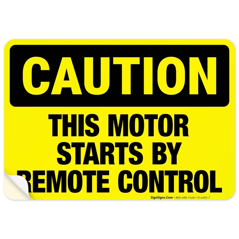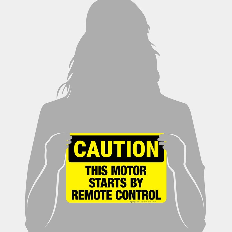 This Motor Starts by Remote Control Sign, OSHA Caution Sign, 10x7 Inches, 4 Mil Vinyl Decal Stickers Weather Resistant Long Lasting UV Protected, Made in USA