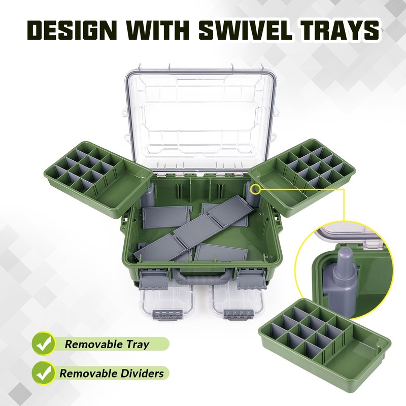 - STURDY AND WATERPROOF: The waterproof tackle box is made of high-quality ABS+PP material, which ensures maximum durability and impact resistance, perfect for storing bait and other fishing gear. The waterproof tackle box also features a 360-degree waterproof airtight rubber gasket that keeps lures, floats and other accessories dry. And with its floatation properties, you won't have to worry about dropping it in the water, making it a great companion for fishing from your boat or kayak.