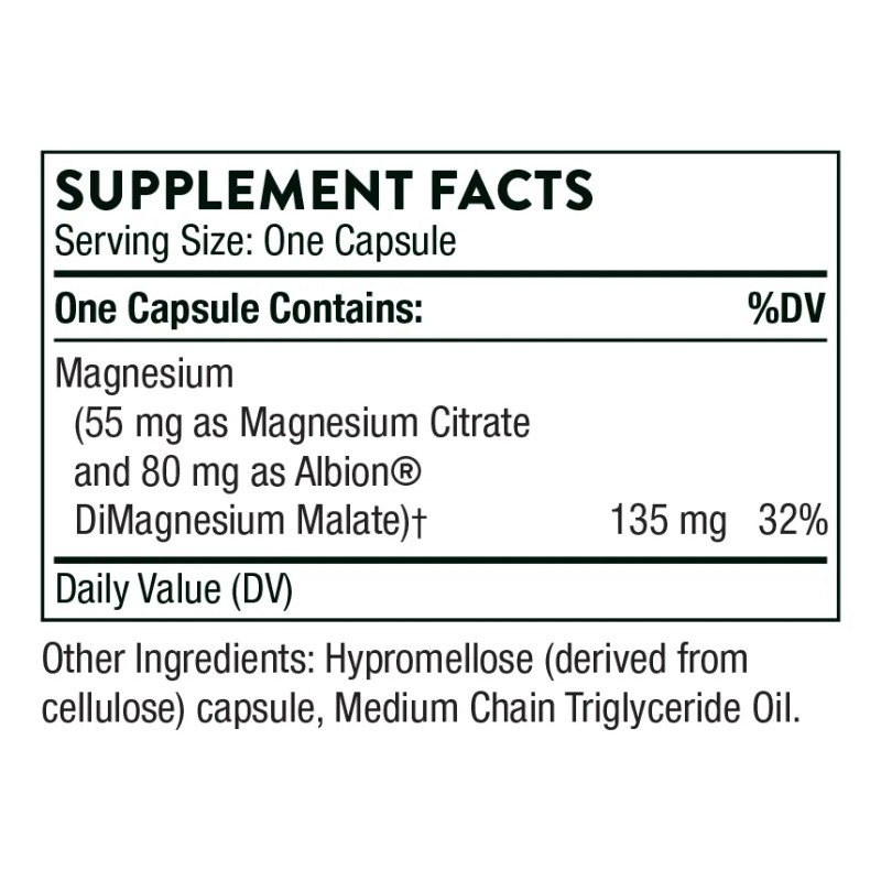- Una forma de magnesio que se absorbe bien y que favorece el corazón y los músculos esqueléticos. Obtenga apoyo para más de 600 procesos enzimáticos, función cardíaca y pulmonar saludable, densidad ósea, sensibilidad muscular y fatiga. Tamaño de la porción: 1 cápsula Porciones por envase: 90 Otros ingredientes: Cápsula de hipromelosa, triglicéridos de cadena media. El mineral magnesio es crucial para el correcto funcionamiento del organismo porque el magnesio interviene en más de 600 reacciones enzimáticas del organismo. Según las estadísticas de la Organización Mundial de la Salud, hasta tres de cada cuatro adultos estadounidenses no alcanzan la ingesta diaria recomendada de 420 mg de magnesio de la Administración de Alimentos y Medicamentos de EE. UU. Una deficiencia de magnesio puede manifestarse de diversas maneras, como un metabolismo deficiente del azúcar en sangre, calambres o dolor muscular, espasmos palpebrales, fatiga y falta de sueño. ¿Por qué es importante el magnesio?