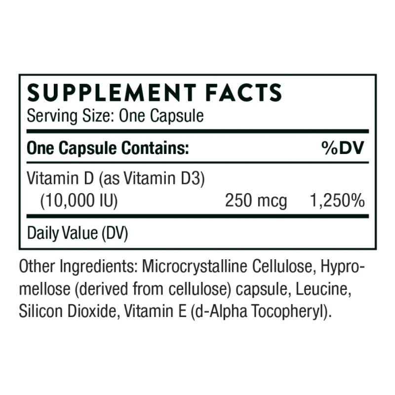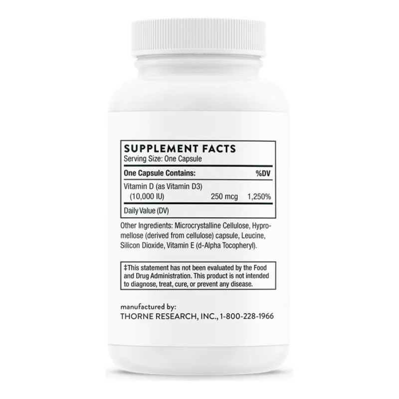 Obtenga la vitamina que favorece la salud de los dientes, los huesos y los músculos, así como la función cardiovascular e inmunológica* La vitamina D, en su forma D3, es más potente y se absorbe mejor que su forma D2. Los suplementos de vitamina D de Thorne no contienen lactosa ni conservantes. Thorne's D-10,000 contiene 10. 000 UI de vitamina D3 de alta calidad. Aunque es bien sabido que la luz solar directa es una fuente natural de vitamina D, muchas personas, especialmente las mayores, no obtienen suficiente vitamina D de la luz solar o de su dieta. Asegúrese de obtener la vitamina D que su cuerpo necesita con Vitamina D-10,000 de Thorne, que se absorbe fácilmente.