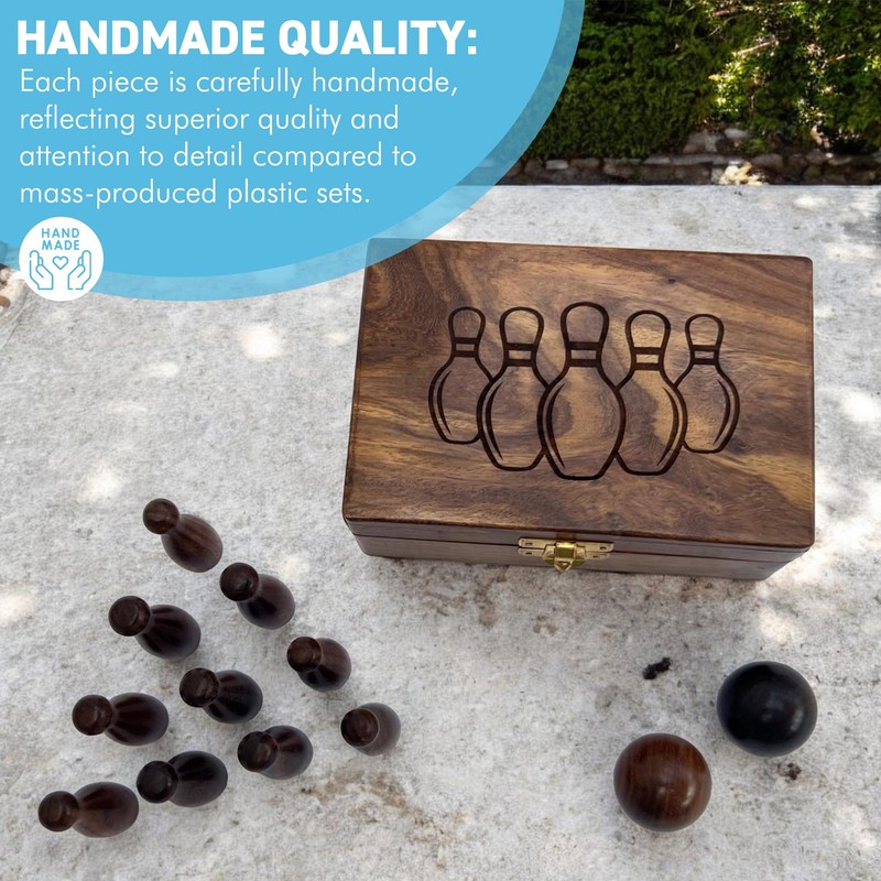 - STORAGE SOLUTION: The premium wooden bowling set comes with a beautifully designed solid wood storage box that adds sophistication to the set while keeping the pins and balls neatly organized and protected. With dimensions of 15cm in length, 10cm in width, and 5cm in depth, and a weight of 355g.