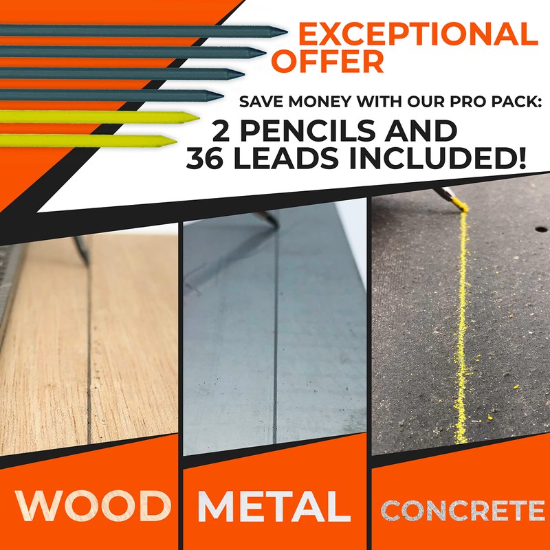 • ✅ SAVE MONEY WITH OUR PRO PACK: 2 PENCILS AND 36 LEADS! Do you have a lot of work to do? With this all-in-one pack, get 2 pencils and three boxes of 12 leads in one order! You'll receive 2 gray leads in the construction pencils + 24 gray and 12 yellow leads in the refill pack. No risk of running out of leads!