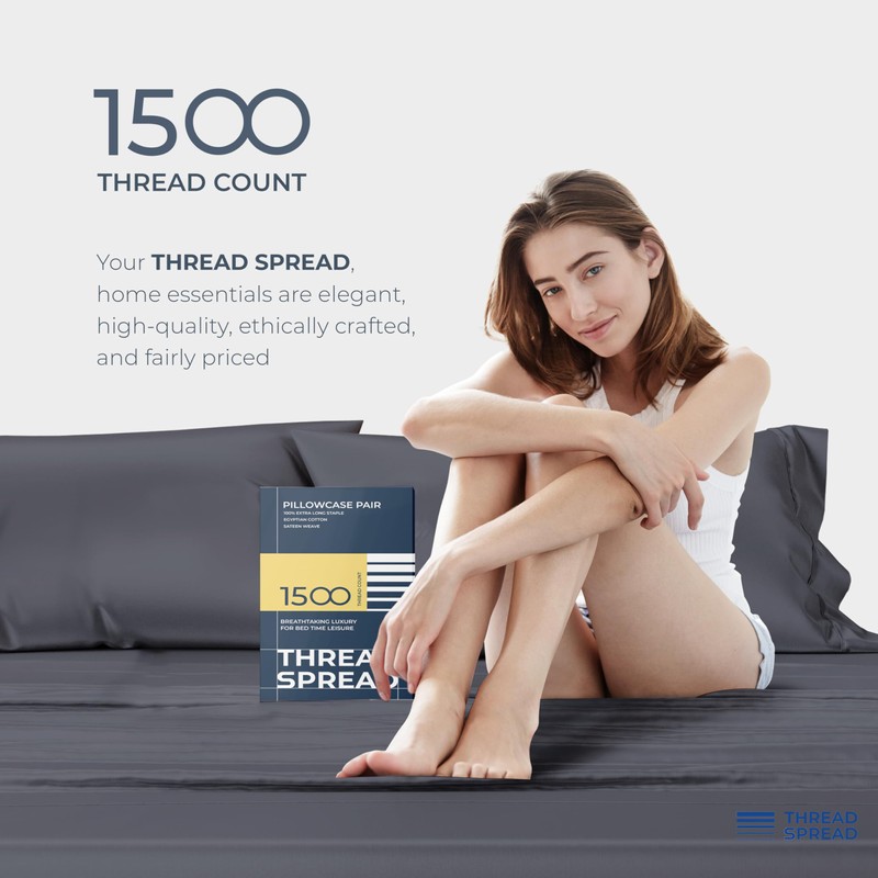 Indulge in unparalleled luxury with Thread Spread’s 1500 Thread Count Egyptian Cotton Pillowcases, crafted to elevate your sleep to new heights of opulence. Woven from the finest extra-long staple cotton, our pillowcases boast an incomparable softness and silkiness, caressing your skin and hair with each touch. The sateen weave enhances their luxurious texture, imbuing them with a radiant, silk-like sheen that transcends the ordinary. Experience supreme comfort and breathability year-round, thanks to the natural cooling properties of 100% Egyptian cotton. These pillowcases are particularly ideal for summer, wicking moisture away and maximizing airflow to keep you refreshingly cool throughout the night. Unveil the richness and density of our 1500 thread count Egyptian cotton pillowcases, reminiscent of those found in prestigious 7-star hotel bedding collections. Treat yourself or your loved ones to the epitome of luxury, whether paired with our large pillows or as part of a complete sheet set. Crafted for a perfect fit, our pillowcases feature envelope closures for effortless pillow insertion and a refined 4-inch Z hem for an extra touch of sophistication. Meticulously mercerized and rigorously tested for color fastness, pilling, and shrinkage, they are designed to withstand the test of time. With each wash, our premium cotton pillowcases grow softer and more resistant to fading and pilling, ensuring enduring beauty and comfort. Simply machine wash in warm water on a gentle cycle, tumble dry on low, and iron while slightly damp to maintain their smooth appearance. Embrace the pinnacle of luxury with Thread Spread’s 1500 Thread Count Egyptian Cotton Pillowcases—a testament to refinement and indulgence