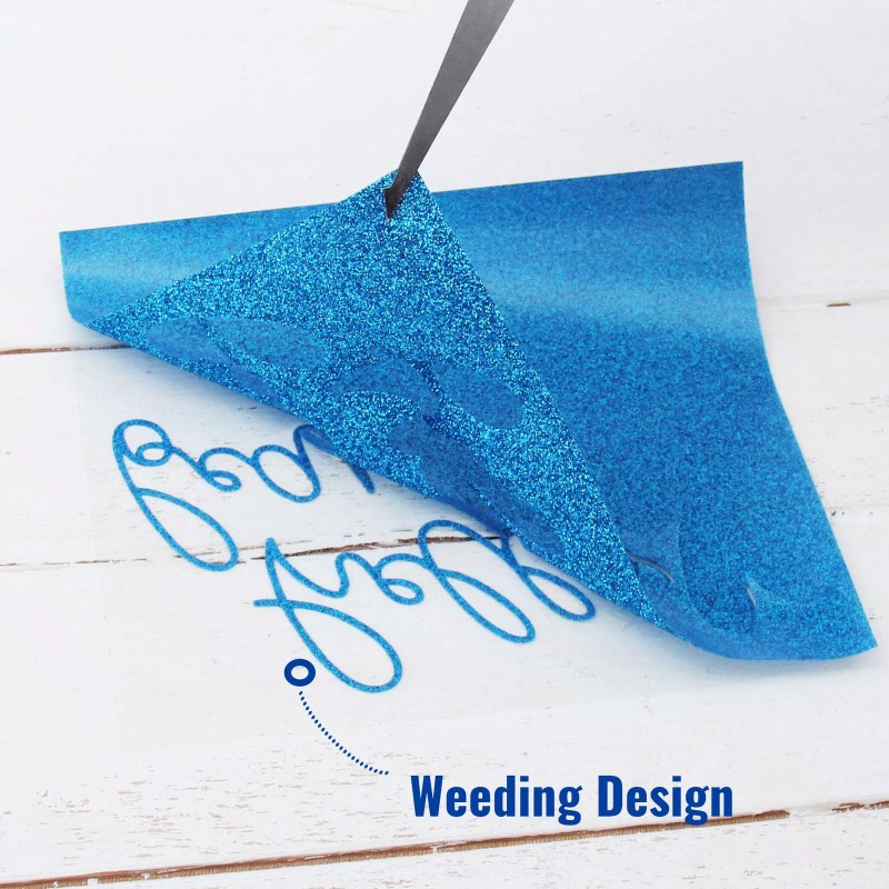 - Glitter style Heat Transfer Vinyl Film. White, Red, Green, Silver, Gold, and Blue glitter style sheets included in pack. Heavy duty heat transfer vinyl, great iron on HTV vinyl. Create your own design and transfer it directly on to any cloth item of your choice such as t-shirts, bags, cushion covers, pants, jackets, etc. Works great with Cricut, Silhouette cameo, heat press machine or any craft cutters.