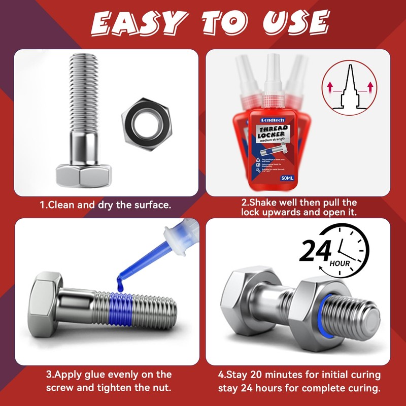• Easy to Use: Simply apply the threadlocker evenly to the thread, lock and seal the nut, and cure initially for 20 minutes, then fully cure within 24 hours