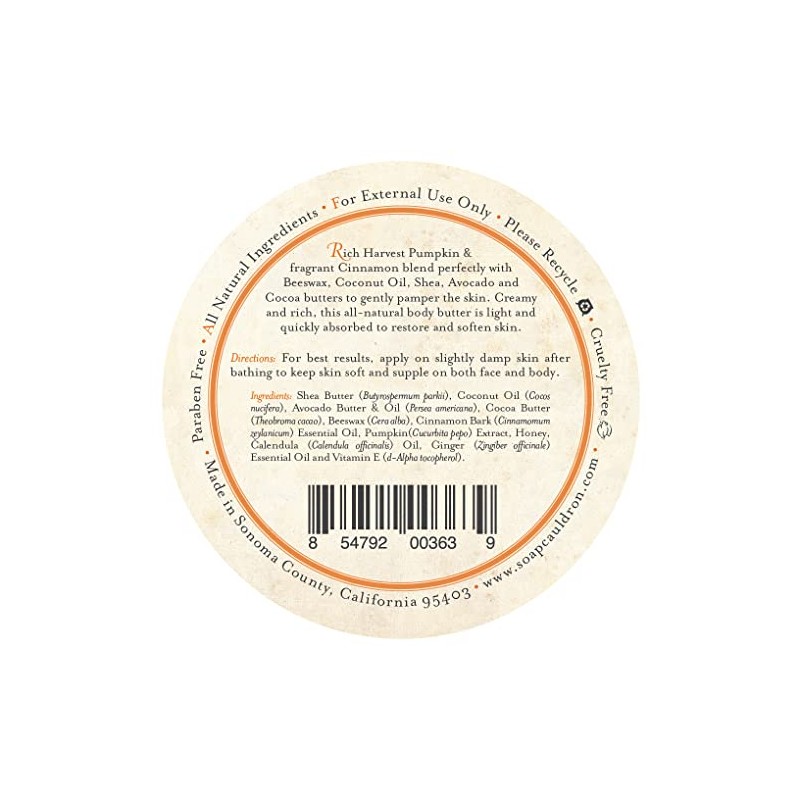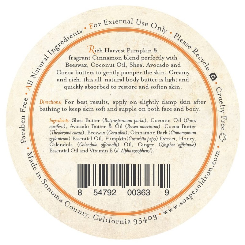 Rich Harvest Pumpkin & fragrant Cinnamon blend perfectly with Beeswax, Coconut Oil, Shea, Avocado and Cocoa butters to gently pamper the skin. Creamy and rich, but never greasy this all-natural, body butter is light and instantly absorbed to restore and soften skin.