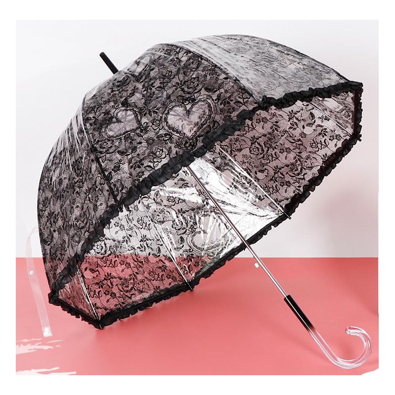 ThreeH Clear Rose Lace Umbrella Elegant Design Windproof Transparent Dome Canopy Automatic Open for Women Ladies Wedding Prom,Black