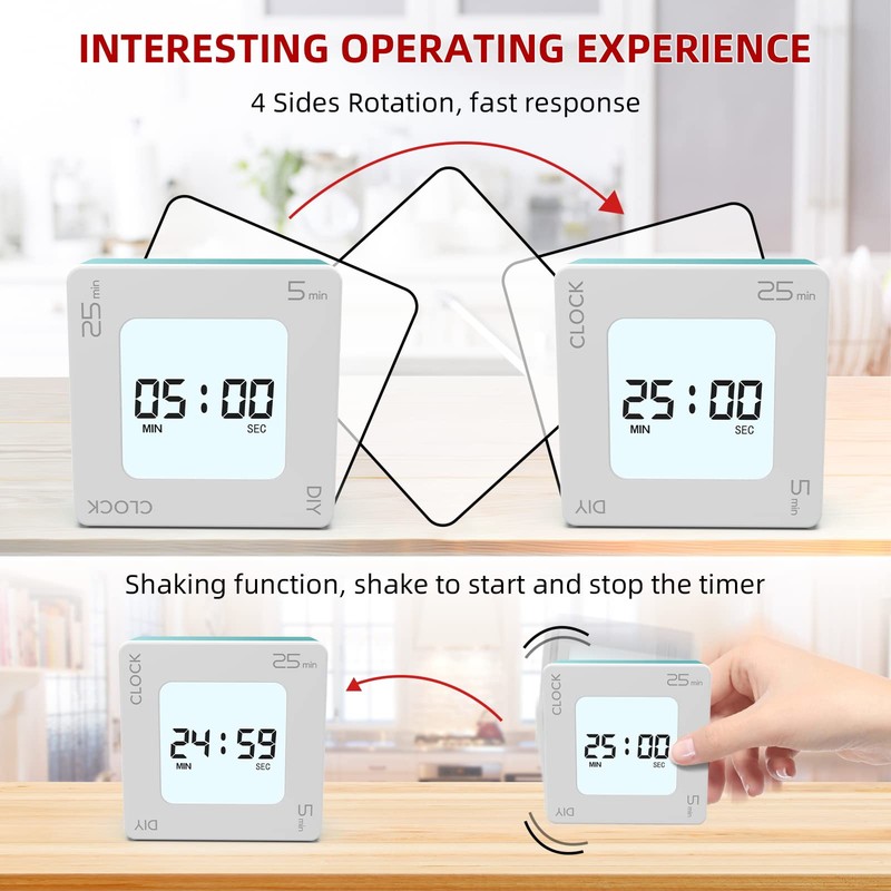 ✔Easy to use, four-sided flip display, clock clockwise flip clock, DIY custom every minute timer, 5 minute timer, 25 minute timer, all timing start or pause is realized by shaking the product, no button operation in the whole process, go on your tedious setup time.
